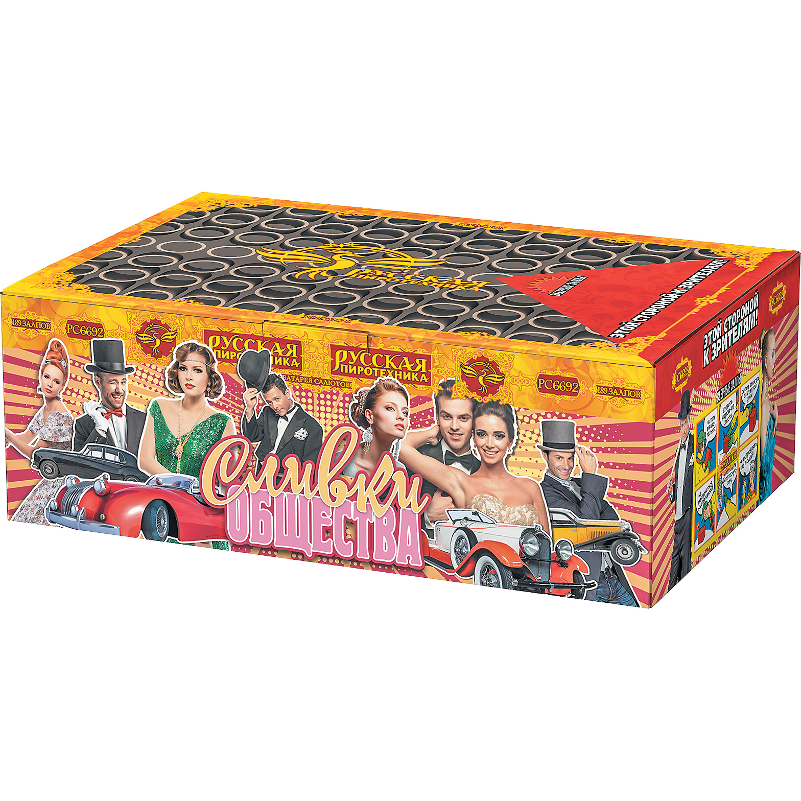 Два уровня. Свистящие элементы, разноцветные кометы разрываются сферами из: серебряных форсов с красными огнями на концах и множества трещащих искр.